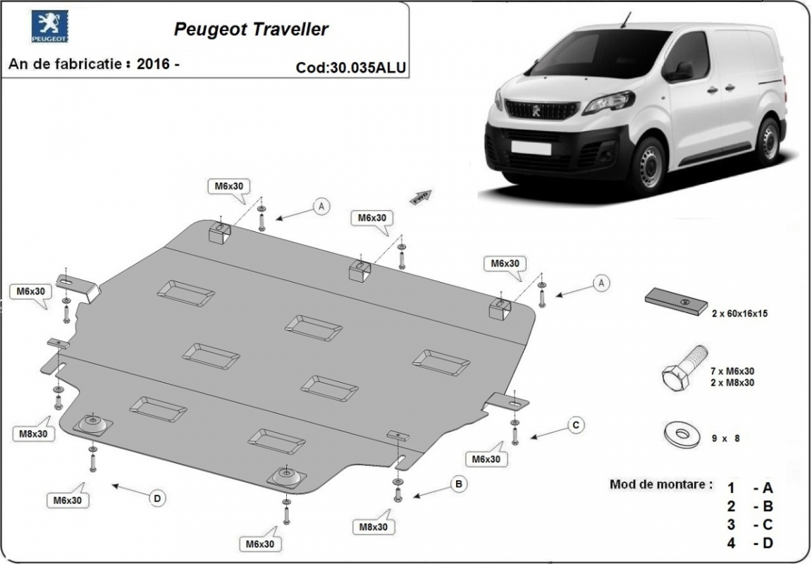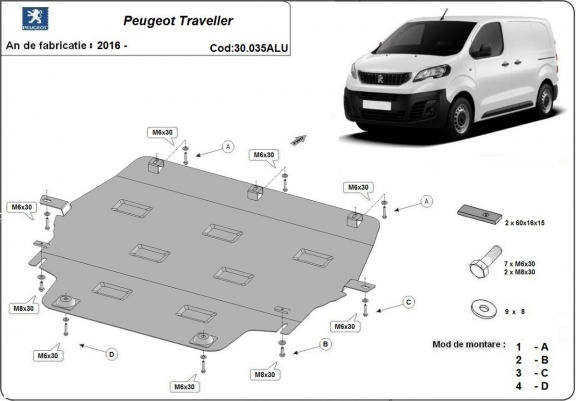 Skid plate for the protection of the: engine, gearbox, radiator The skid plate is new and fits perfectly for all versions of Peugeot Traveller manufactured between 2016 and 2026. Made out of 3 mm thick Aluminium plate. The shields are made of aluminum, but the mounting brackets are made of steel. Screws, nuts, clips, all fastening accessories are included. All skid plates are powder coated to prevent corrosion. The exterior of the skid plate is provided with Aluminium reinforcements, which increases the resistance to impact. |