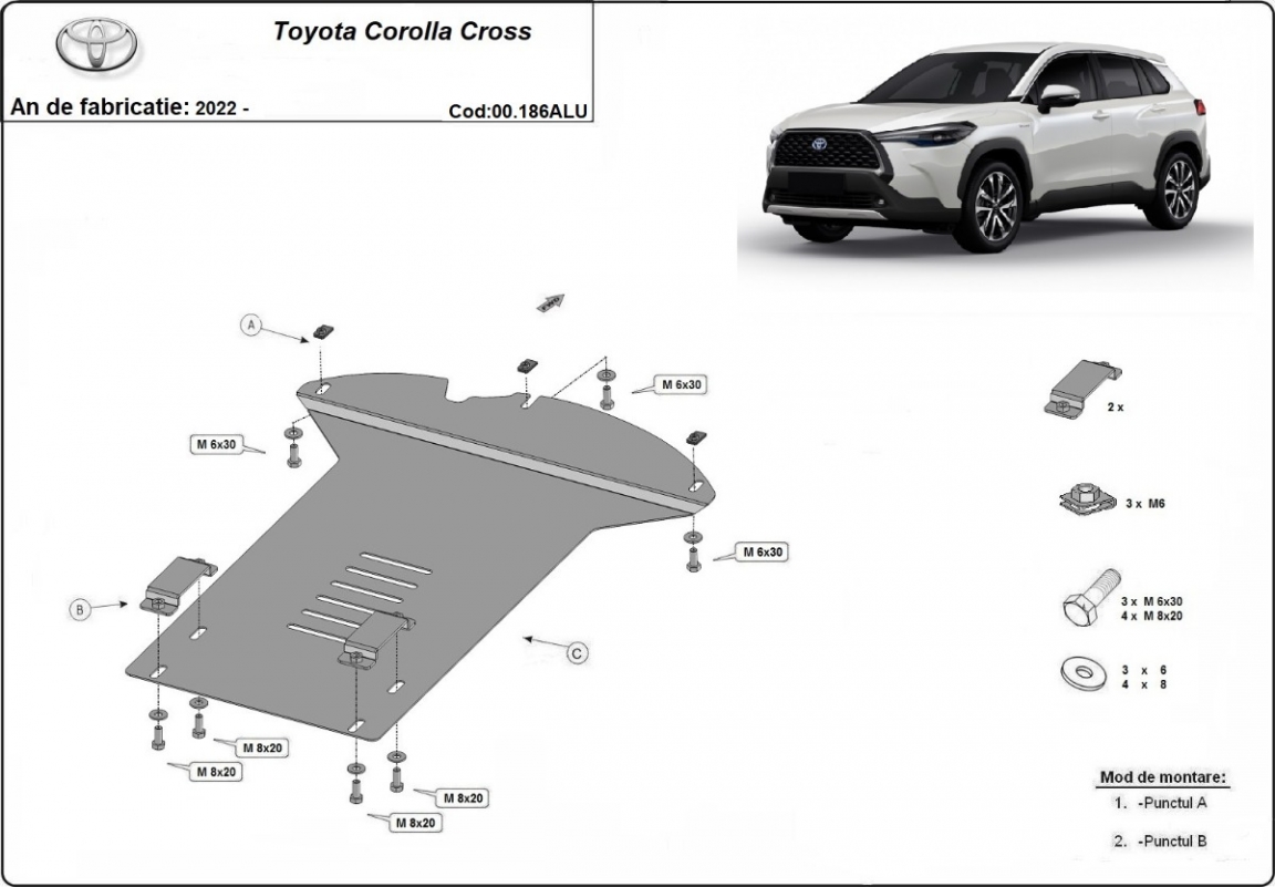 Skid plate for the protection of the: Catalytic converter The skid plate is new and fits perfectly for all versions of Toyota Corolla Cross manufactured between 2022 and 2026. Made out of 3 mm thick Aluminium plate. The shields are made of aluminum, but the mounting brackets are made of steel. Screws, nuts, clips, all fastening accessories are included. All skid plates are powder coated to prevent corrosion. The exterior of the skid plate is provided with Aluminium reinforcements, which increases the resistance to impact. |