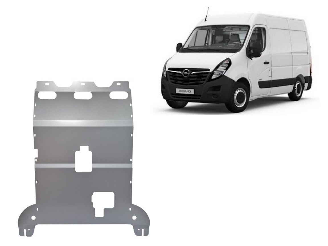Skid plate for the protection of the: engine, gearbox, radiator The skid plate is new and fits perfectly for all versions of Opel Movano manufactured between 2022 and 2026. Made out of 4 mm thick Aluminium plate. The shields are made of aluminum, but the mounting brackets are made of steel. Screws, nuts, clips, all fastening accessories are included. All skid plates are powder coated to prevent corrosion. The exterior of the skid plate is provided with Aluminium reinforcements, which increases the resistance to impact. |