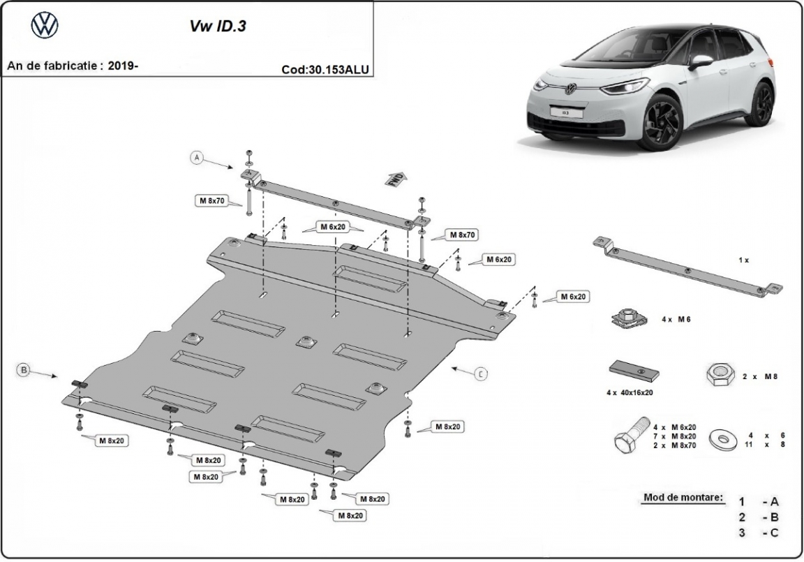 Skid plate for the protection of the: engine, gearbox, radiator The skid plate is new and fits perfectly for all versions of Volkswagen ID.3 manufactured between 2019 and 2026. Made out of 3 mm thick Aluminium plate. The shields are made of aluminum, but the mounting brackets are made of steel. Screws, nuts, clips, all fastening accessories are included. All skid plates are powder coated to prevent corrosion. The exterior of the skid plate is provided with Aluminium reinforcements, which increases the resistance to impact. |