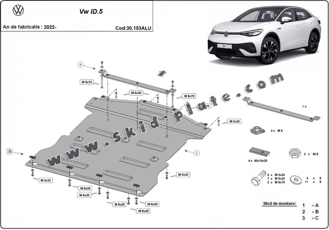 Skid plate for the protection of the: engine, gearbox, radiator The skid plate is new and fits perfectly for all versions of Volkswagen ID.5 manufactured between 2022 and 2025. Made out of 3 mm thick Aluminium plate. The shields are made of aluminum, but the mounting brackets are made of steel. Screws, nuts, clips, all fastening accessories are included. All skid plates are powder coated to prevent corrosion. The exterior of the skid plate is provided with Aluminium reinforcements, which increases the resistance to impact. |