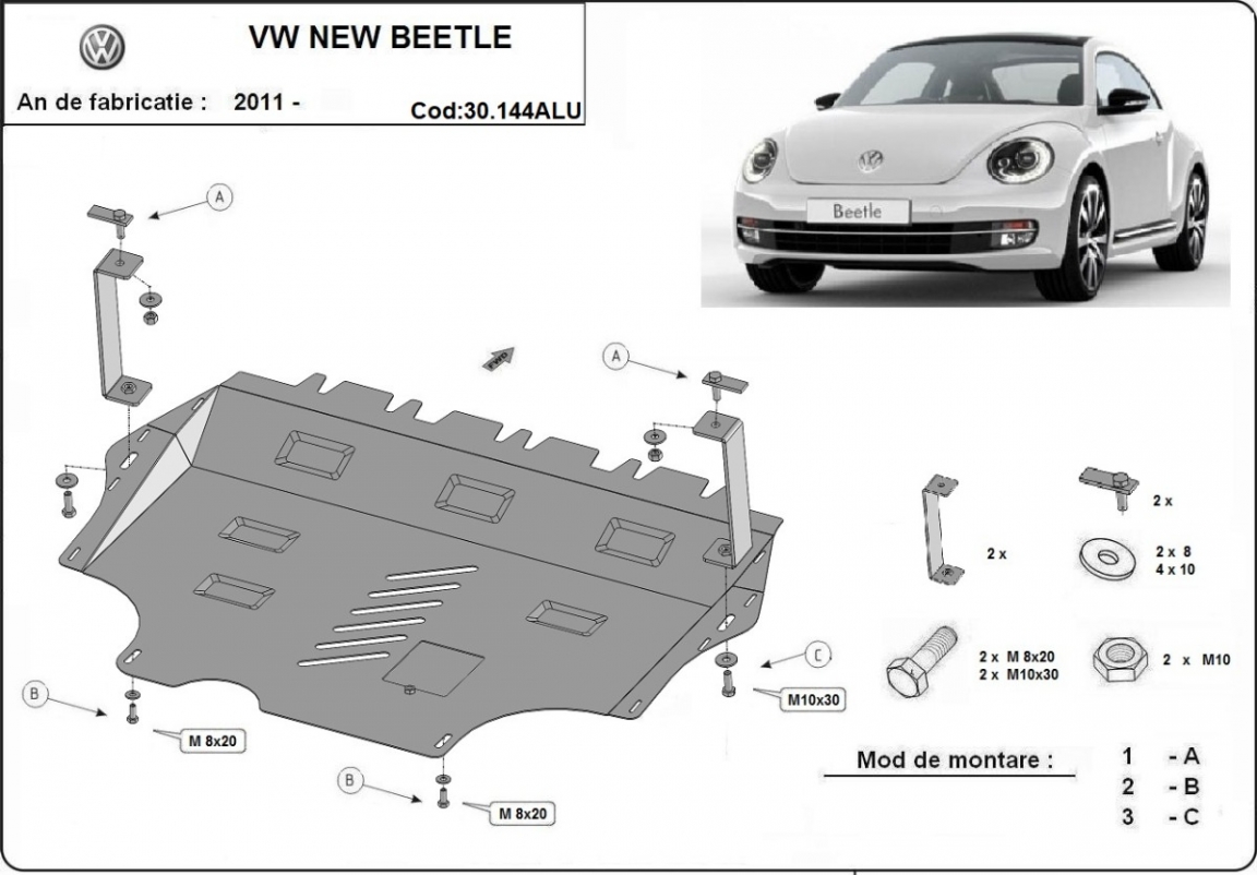 Skid plate for the protection of the: engine, gearbox, radiator The skid plate is new and fits perfectly for all versions of Volkswagen New Beetle manufactured between 2011 and 2017. Made out of 3 mm thick Aluminium plate. The shields are made of aluminum, but the mounting brackets are made of steel. Screws, nuts, clips, all fastening accessories are included. All skid plates are powder coated to prevent corrosion. The exterior of the skid plate is provided with Aluminium reinforcements, which increases the resistance to impact. |