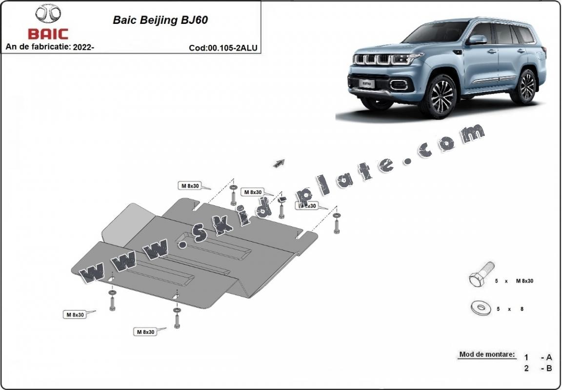 Skid plate for the protection of the: Transfer case The skid plate is new and fits perfectly for the Baic Beijing BJ60, with the following engine/drive versions: Toate - manufactured between 2022 and 2025. Made out of 4 mm thick Aluminium plate. The shields are made of aluminum, but the mounting brackets are made of steel. Screws, nuts, clips, all fastening accessories are included. All skid plates are powder coated to prevent corrosion. The exterior of the skid plate is provided with Aluminium reinforcements, which increases the resistance to impact. |