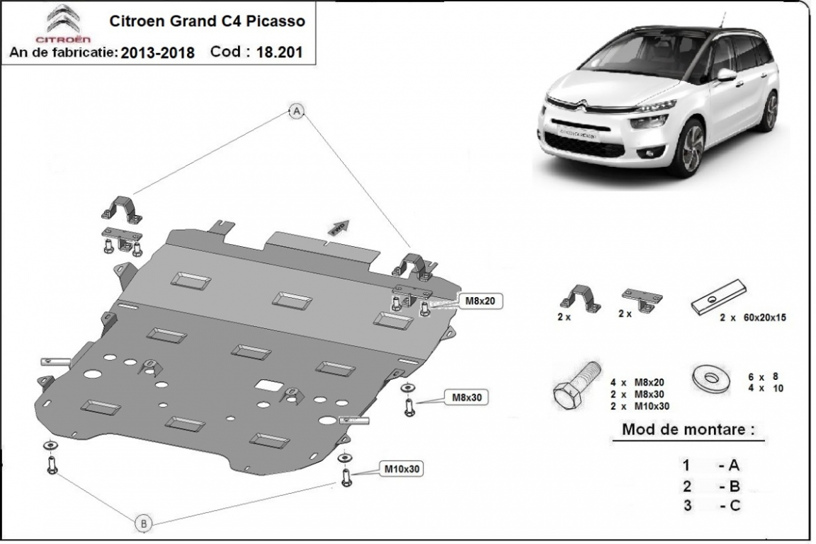 Skid plate for the protection of the: engine, gearbox, radiator, front bumper The skid plate is new and fits perfectly for all versions of Citroen C4 Picasso manufactured between 2013 and 2018. Made out of 2 mm thick Steel plate. Screws, nuts, clips, all fastening accessories are included. All skid plates are powder coated to prevent corrosion. The exterior of the skid plate is provided with Steel reinforcements, which increases the resistance to impact. |