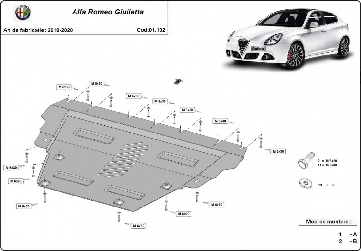 Skid plate for the protection of the: engine, gearbox, radiator The skid plate is new and fits perfectly for all versions of Alfa Romeo Giulietta manufactured between 2010 and 2020. Made out of 2 mm thick Steel plate. Screws, nuts, clips, all fastening accessories are included. All skid plates are powder coated to prevent corrosion. The exterior of the skid plate is provided with Steel reinforcements, which increases the resistance to impact. |