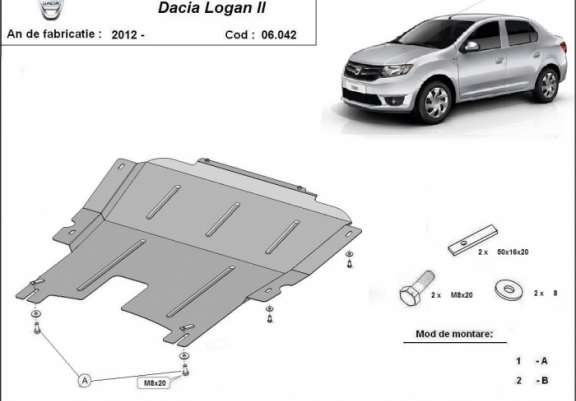 Skid plate for the protection of the: engine, gearbox The skid plate is new and fits perfectly for all versions of Dacia Logan 2 manufactured between 2012 and 2020. Made out of 2 mm thick Steel plate. Screws, nuts, clips, all fastening accessories are included. All skid plates are powder coated to prevent corrosion. The exterior of the skid plate is provided with Steel reinforcements, which increases the resistance to impact. |