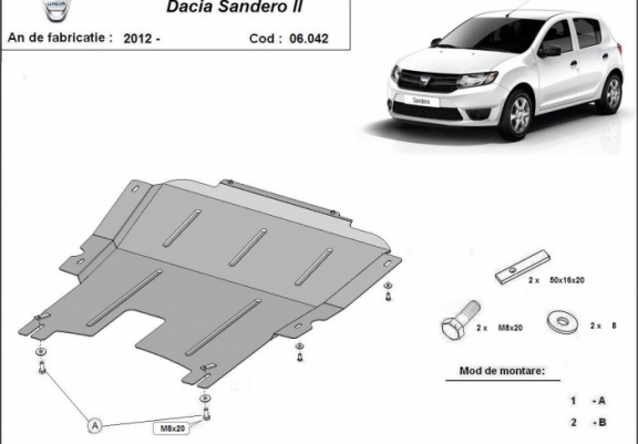 Skid plate for the protection of the: engine, gearbox The skid plate is new and fits perfectly for all versions of Dacia Sandero 2 manufactured between 2012 and 2020. Made out of 2 mm thick Steel plate. Screws, nuts, clips, all fastening accessories are included. All skid plates are powder coated to prevent corrosion. The exterior of the skid plate is provided with Steel reinforcements, which increases the resistance to impact. |