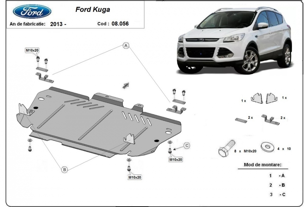 Skid plate for the protection of the: engine, gearbox The skid plate is new and fits perfectly for all versions of Ford Kuga manufactured between 2013 and 2019. Made out of 2 mm thick Steel plate. Screws, nuts, clips, all fastening accessories are included. All skid plates are powder coated to prevent corrosion. The exterior of the skid plate is provided with Steel reinforcements, which increases the resistance to impact. |