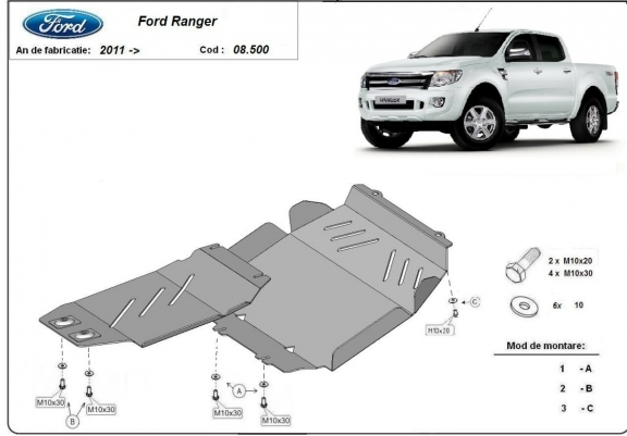 Skid plate for the protection of the: engine, front bumper The skid plate is new and fits perfectly for all versions of Ford Ranger manufactured between 2010 and 2023. Made out of 3 mm thick Steel plate. Screws, nuts, clips, all fastening accessories are included. All skid plates are powder coated to prevent corrosion. The exterior of the skid plate is provided with Steel reinforcements, which increases the resistance to impact. |