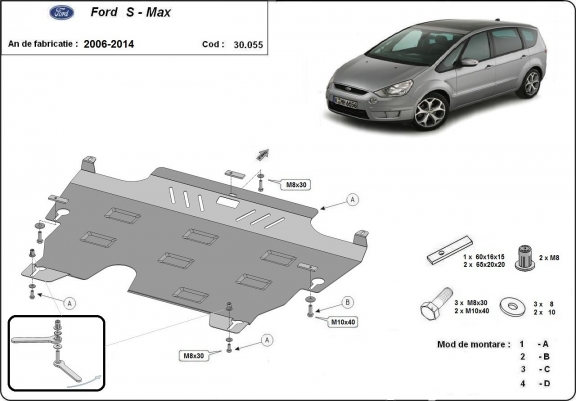 Skid plate for the protection of the: engine, gearbox, radiator The skid plate is new and fits perfectly for all versions of Ford S-Max manufactured between 2006 and 2015. Made out of 2 mm thick Steel plate. Screws, nuts, clips, all fastening accessories are included. All skid plates are powder coated to prevent corrosion. The exterior of the skid plate is provided with Steel reinforcements, which increases the resistance to impact. |