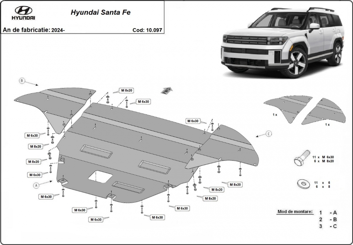 Skid plate for the protection of the: engine, gearbox, radiator, front bumper The skid plate is new and fits perfectly for all versions of Hyundai Santa Fe manufactured between 2024 and 2026. Made out of 2 mm thick Steel plate. Screws, nuts, clips, all fastening accessories are included. All skid plates are powder coated to prevent corrosion. The exterior of the skid plate is provided with Steel reinforcements, which increases the resistance to impact. |
