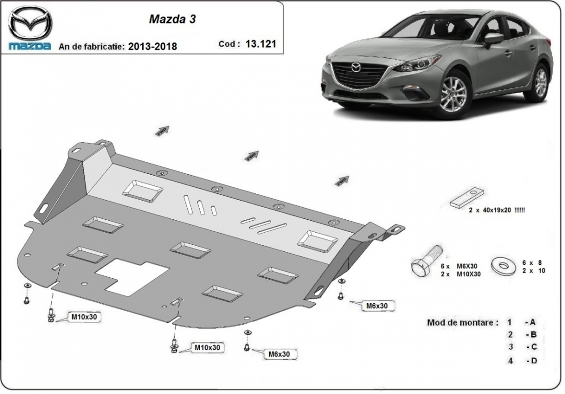 Skid plate for the protection of the: engine, gearbox, radiator The skid plate is new and fits perfectly for all versions of Mazda 3 manufactured between 2013 and 2018. Made out of 2 mm thick Steel plate. Screws, nuts, clips, all fastening accessories are included. All skid plates are powder coated to prevent corrosion. The exterior of the skid plate is provided with Steel reinforcements, which increases the resistance to impact. |