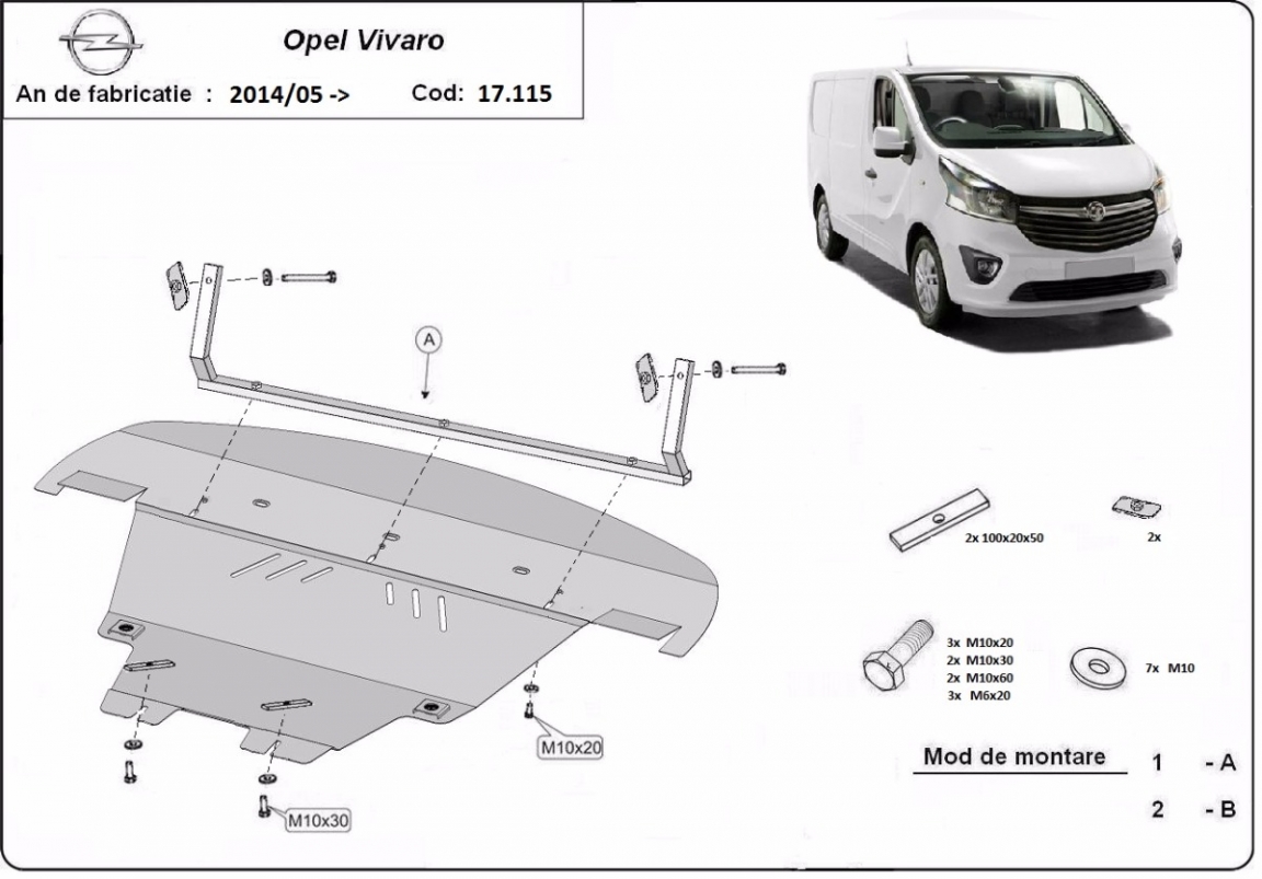 Skid plate for the protection of the: engine, gearbox, radiator, front bumper The skid plate is new and fits perfectly for all versions of Opel Vivaro manufactured between 2014 and 2019. Made out of 2 mm thick Steel plate. Screws, nuts, clips, all fastening accessories are included. All skid plates are powder coated to prevent corrosion. The exterior of the skid plate is provided with Steel reinforcements, which increases the resistance to impact. |