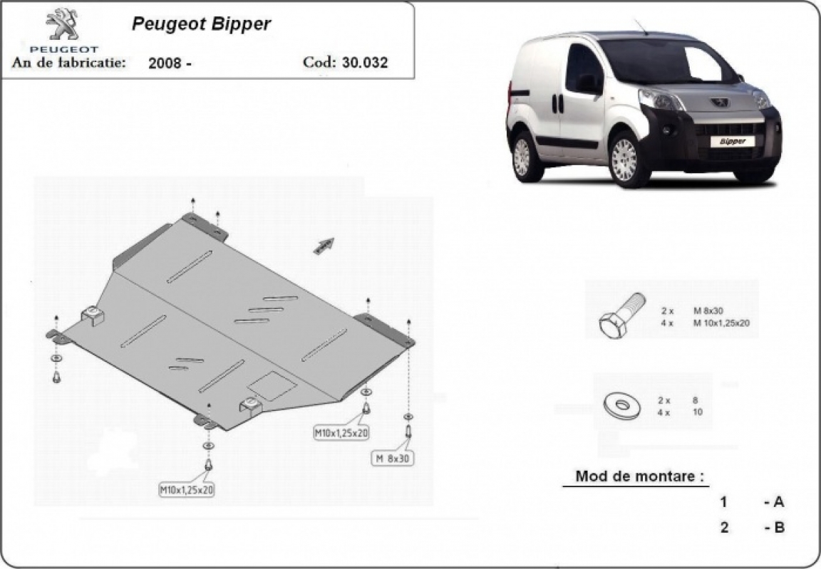 Skid plate for the protection of the: engine, gearbox The skid plate is new and fits perfectly for the Peugeot Bipper, with the following engine/drive versions: 1.4Tdi - manufactured between 2007 and 2021. Made out of 2 mm thick Steel plate. Screws, nuts, clips, all fastening accessories are included. All skid plates are powder coated to prevent corrosion. The exterior of the skid plate is provided with Steel reinforcements, which increases the resistance to impact. |