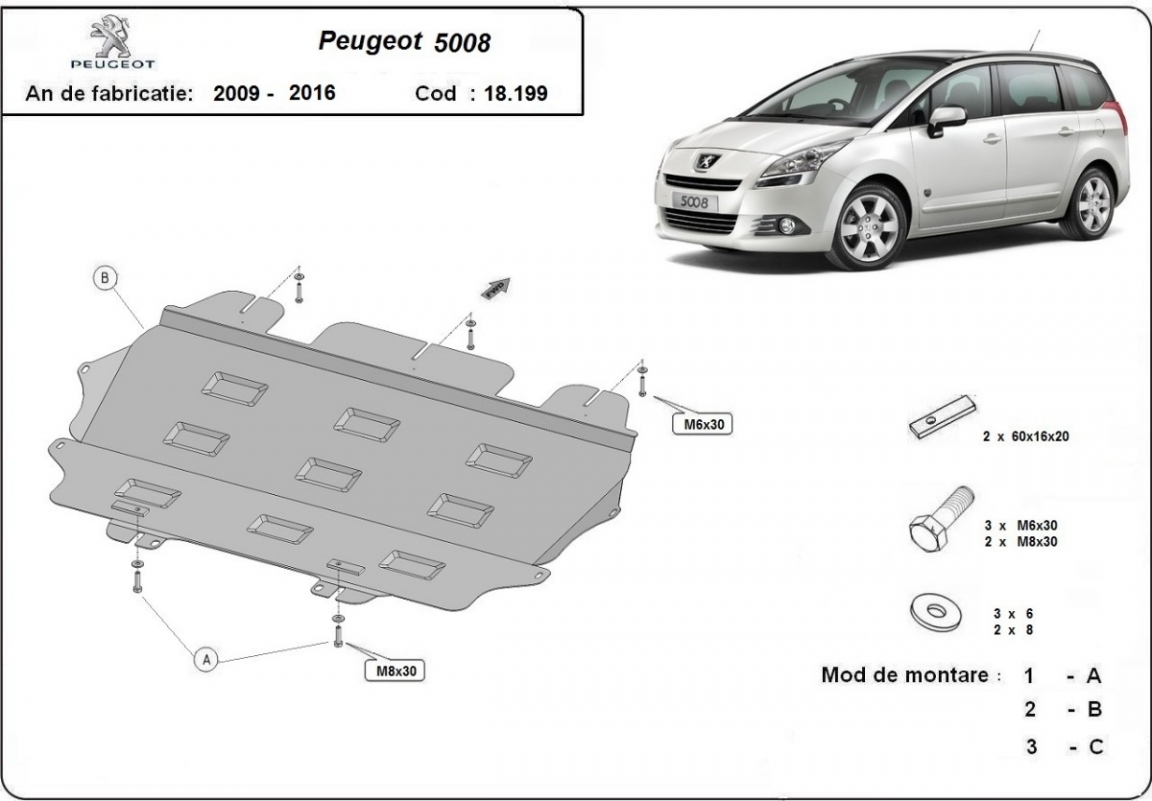 Skid plate for the protection of the: engine, gearbox The skid plate is new and fits perfectly for all versions of Peugeot 5008 manufactured between 2009 and 2017. Made out of 2 mm thick Steel plate. Screws, nuts, clips, all fastening accessories are included. All skid plates are powder coated to prevent corrosion. The exterior of the skid plate is provided with Steel reinforcements, which increases the resistance to impact. |