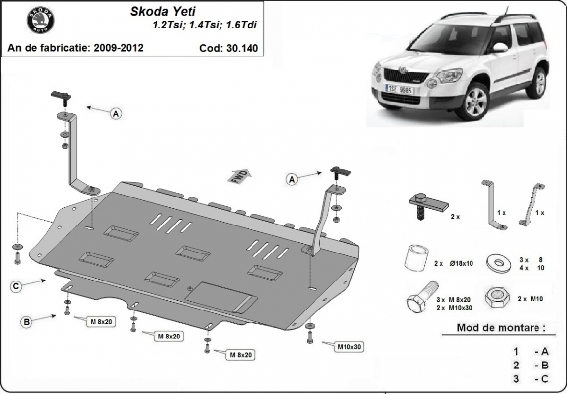 Skid plate for the protection of the: engine, gearbox, radiator The skid plate is new and fits perfectly for the Skoda Yeti, with the following engine/drive versions: 1.2,1.4,TSI, 1.8 , 1.6TDI, 2.0TDI,1.8TSI - manufactured between 2009 and 2012. It has an opening for the oil sump, so it's removal won't be necessary to change the oil. Made out of 2 mm thick Steel plate. Screws, nuts, clips, all fastening accessories are included. All skid plates are powder coated to prevent corrosion. The exterior of the skid plate is provided with Steel reinforcements, which increases the resistance to impact. |