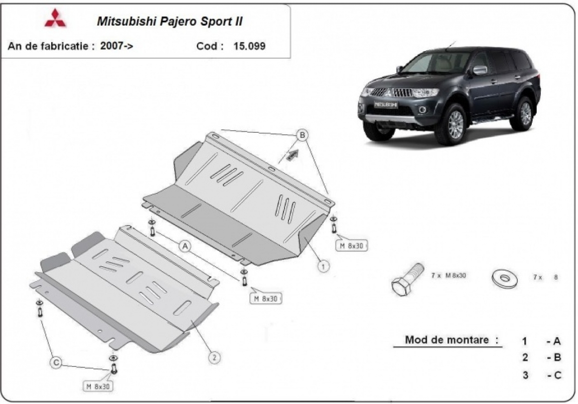 Skid plate for the protection of the: engine, radiator The skid plate is new and fits perfectly for all versions of Mitsubishi Pajero Sport 2 manufactured between 2008 and 2016. Made out of 3 mm thick Steel plate. Screws, nuts, clips, all fastening accessories are included. All skid plates are powder coated to prevent corrosion. The exterior of the skid plate is provided with Steel reinforcements, which increases the resistance to impact. |