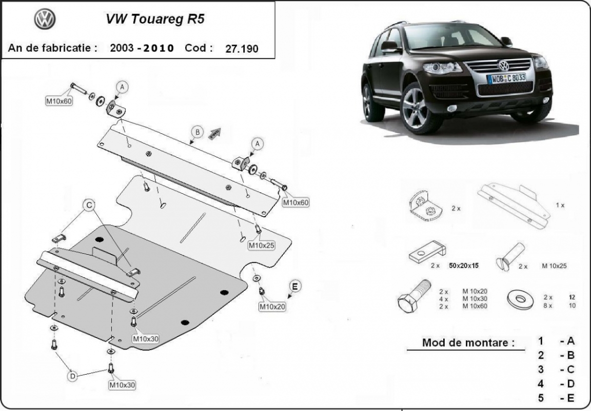 Skid plate for the protection of the: engine The skid plate is new and fits perfectly for all versions of Volkswagen Touareg 7L manufactured between 2003 and 2010. Made out of 3 mm thick Steel plate. Screws, nuts, clips, all fastening accessories are included. All skid plates are powder coated to prevent corrosion. The exterior of the skid plate is provided with Steel reinforcements, which increases the resistance to impact. |