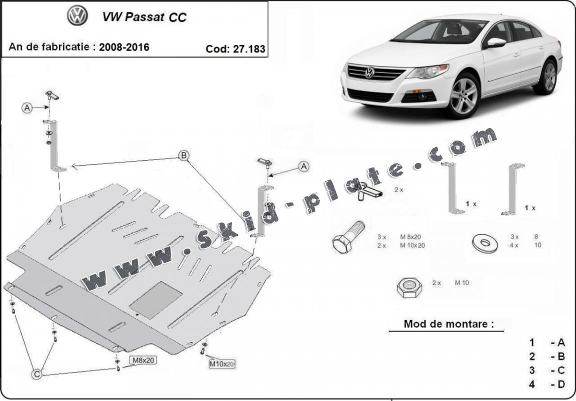 Skid plate for the protection of the: engine, gearbox, radiator, front bumper The skid plate is new and fits perfectly for the VW Passat CC, with the following engine/drive versions: 2.0 TFSI quattro,1.9-2.0,Tdi, - manufactured between 2008 and 2016. It has an opening for the oil sump, so it's removal won't be necessary to change the oil. Made out of 2 mm thick Steel plate. Screws, nuts, clips, all fastening accessories are included. All skid plates are powder coated to prevent corrosion. The exterior of the skid plate is provided with Steel reinforcements, which increases the resistance to impact. |