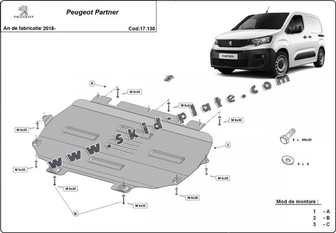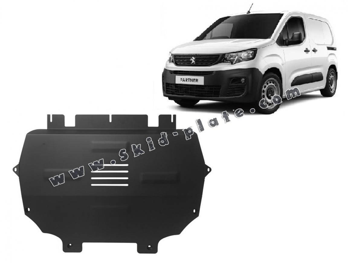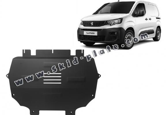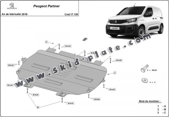 Skid plate for the protection of the: engine, gearbox, radiator The skid plate is new and fits perfectly for all versions of Peugeot Partner manufactured between 2018 and 2025. Made out of 2 mm thick Steel plate. Screws, nuts, clips, all fastening accessories are included. All skid plates are powder coated to prevent corrosion. The exterior of the skid plate is provided with Steel reinforcements, which increases the resistance to impact. |