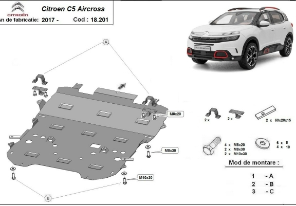 Skid plate for the protection of the: engine, gearbox, radiator, front bumper The skid plate is new and fits perfectly for all versions of Citroen C5 Aircross manufactured between 2017 and 2026. Made out of 2 mm thick Steel plate. Screws, nuts, clips, all fastening accessories are included. All skid plates are powder coated to prevent corrosion. The exterior of the skid plate is provided with Steel reinforcements, which increases the resistance to impact. |