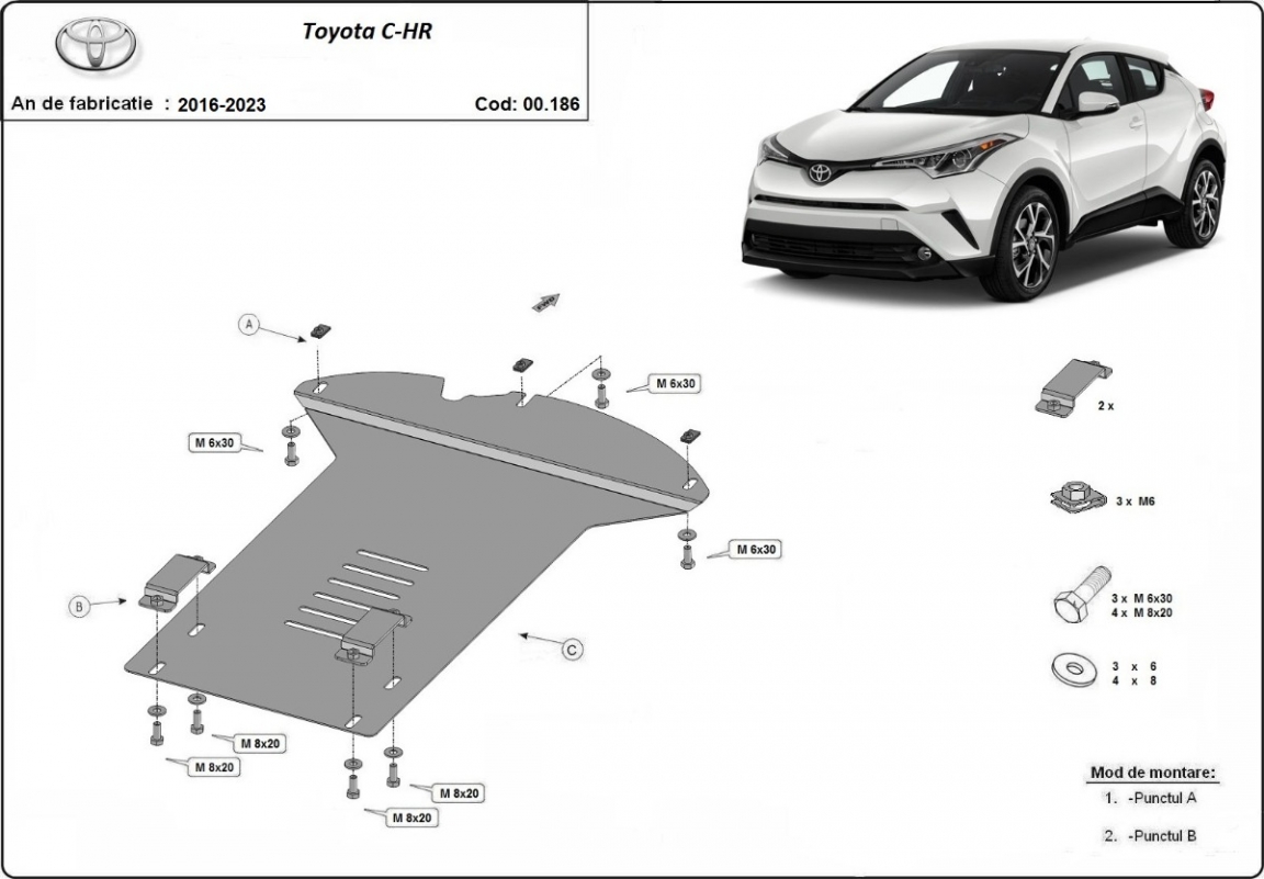 Skid plate for the protection of the: Catalytic converter The skid plate is new and fits perfectly for all versions of Toyota C-HR manufactured between 2016 and 2023. Made out of 2 mm thick Steel plate. Screws, nuts, clips, all fastening accessories are included. All skid plates are powder coated to prevent corrosion. The exterior of the skid plate is provided with Steel reinforcements, which increases the resistance to impact. |