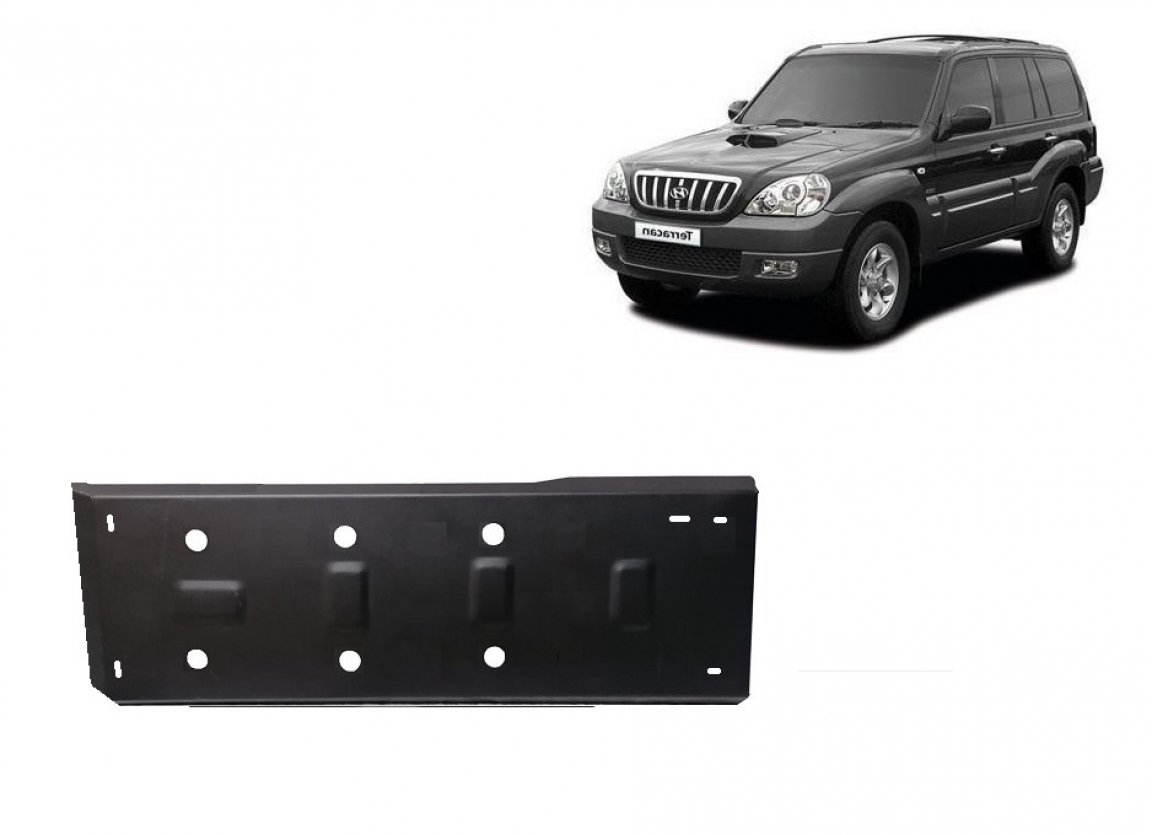 Skid plate for the protection of the: fuel tank The skid plate is new and fits perfectly for all versions of Hyundai Terracan manufactured between 2001 and 2007. Made out of 2 mm thick Steel plate. Screws, nuts, clips, all fastening accessories are included. All skid plates are powder coated to prevent corrosion. The exterior of the skid plate is provided with Steel reinforcements, which increases the resistance to impact. |