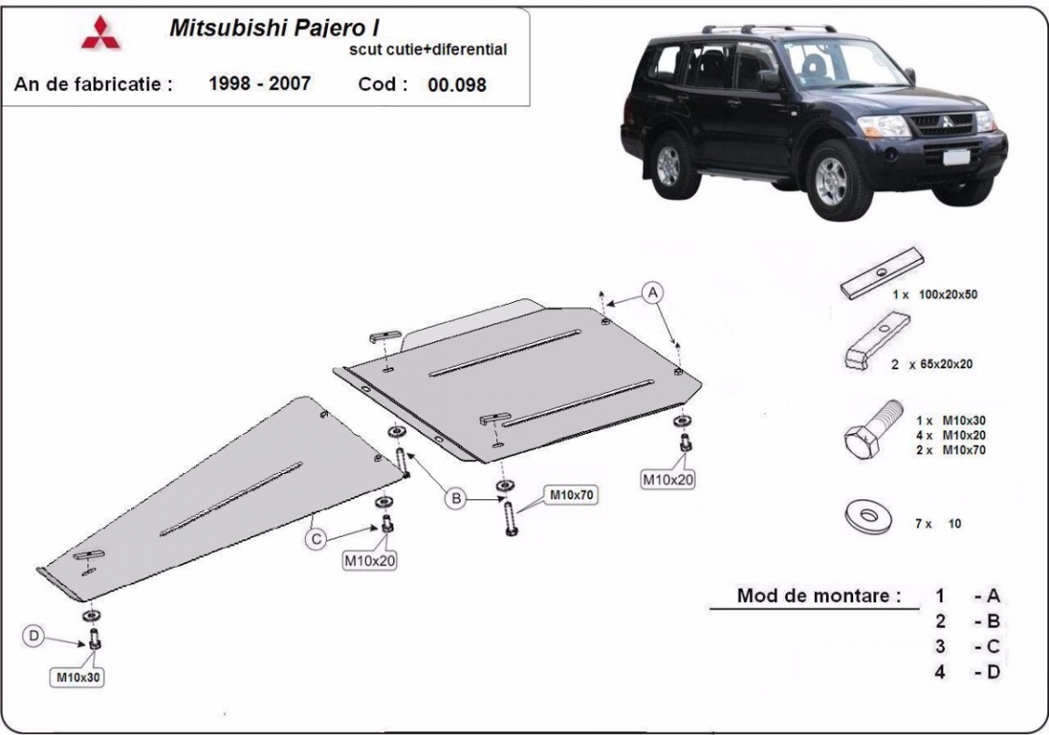 Skid plate for the protection of the: gearbox, differential The skid plate is new and fits perfectly for the Mitsubishi Pajero Sport 1, with the following engine/drive versions: - manufactured between 1998 and 2007. Made out of 3 mm thick Steel plate. Screws, nuts, clips, all fastening accessories are included. All skid plates are powder coated to prevent corrosion. The exterior of the skid plate is provided with Steel reinforcements, which increases the resistance to impact. |