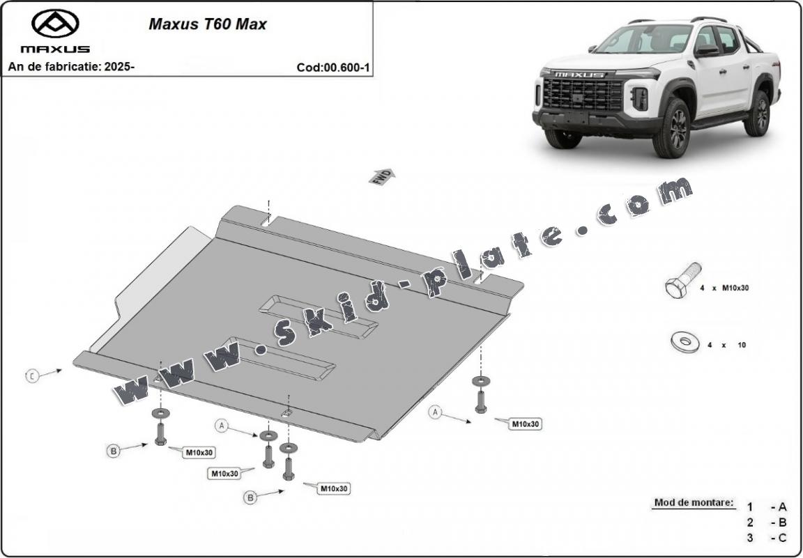 Skid plate for the protection of the: gearbox The skid plate is new and fits perfectly for all versions of Maxus T60 Max manufactured between 2025 and 2025. Made out of 3 mm thick Steel plate. Screws, nuts, clips, all fastening accessories are included. All skid plates are powder coated to prevent corrosion. The exterior of the skid plate is provided with Steel reinforcements, which increases the resistance to impact. |