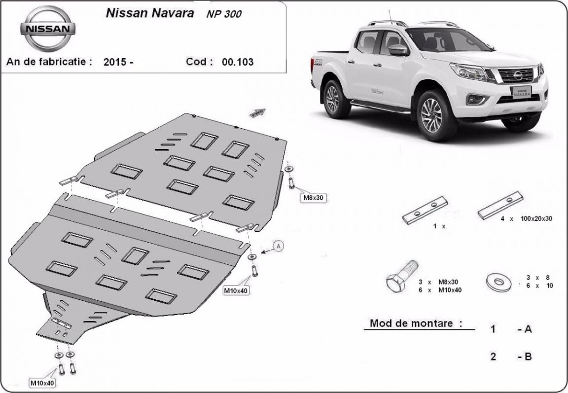Skid plate for the protection of the: gearbox, transfer case The skid plate is new and fits perfectly for all versions of Nissan Navara NP300 manufactured between 2015 and 2021. Made out of 3 mm thick Steel plate. Screws, nuts, clips, all fastening accessories are included. All skid plates are powder coated to prevent corrosion. The exterior of the skid plate is provided with Steel reinforcements, which increases the resistance to impact. |