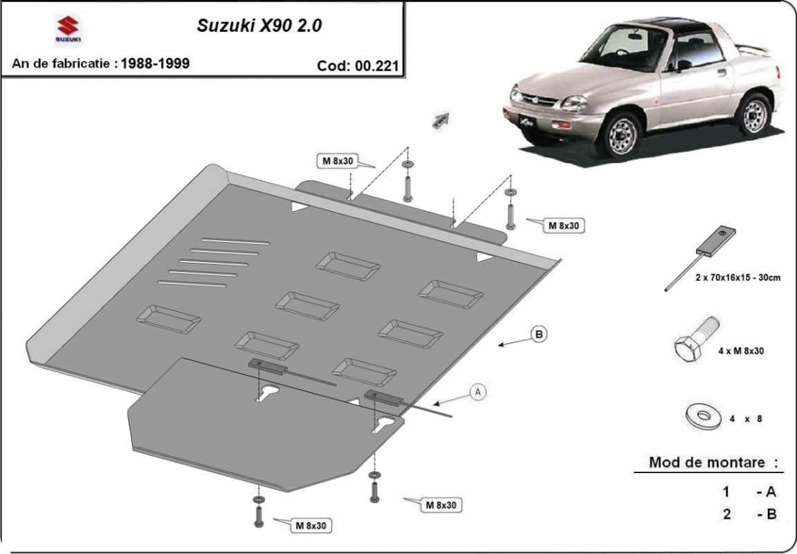 Skid plate for the protection of the: gearbox, Transfer case The skid plate is new and fits perfectly for the Suzuki X90, with the following engine/drive versions: 2.0 petrol - manufactured between 1988 and 1999. Made out of 2.5 mm thick Steel plate. Screws, nuts, clips, all fastening accessories are included. All skid plates are powder coated to prevent corrosion. The exterior of the skid plate is provided with Steel reinforcements, which increases the resistance to impact. |