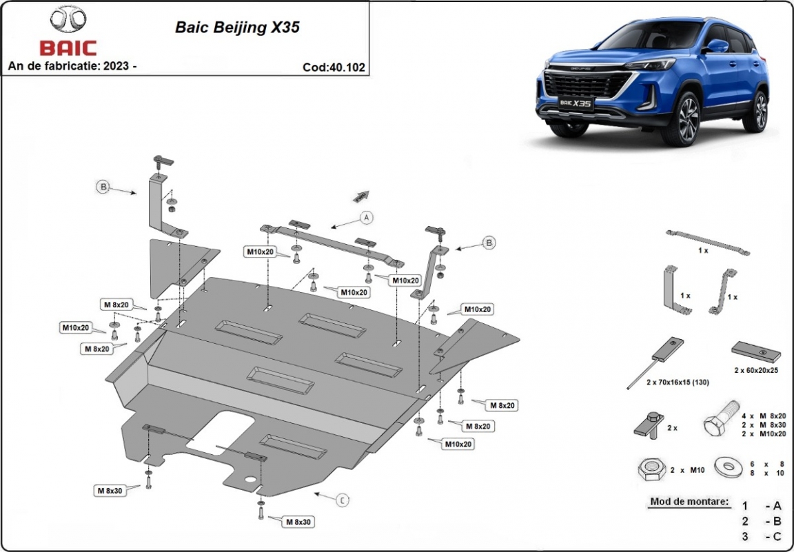 Skid plate for the protection of the: engine, gearbox, radiator, front bumper The skid plate is new and fits perfectly for all versions of Baic Beijing X35 manufactured between 2023 and 2026. Made out of 2 mm thick Steel plate. Screws, nuts, clips, all fastening accessories are included. All skid plates are powder coated to prevent corrosion. The exterior of the skid plate is provided with Steel reinforcements, which increases the resistance to impact. |