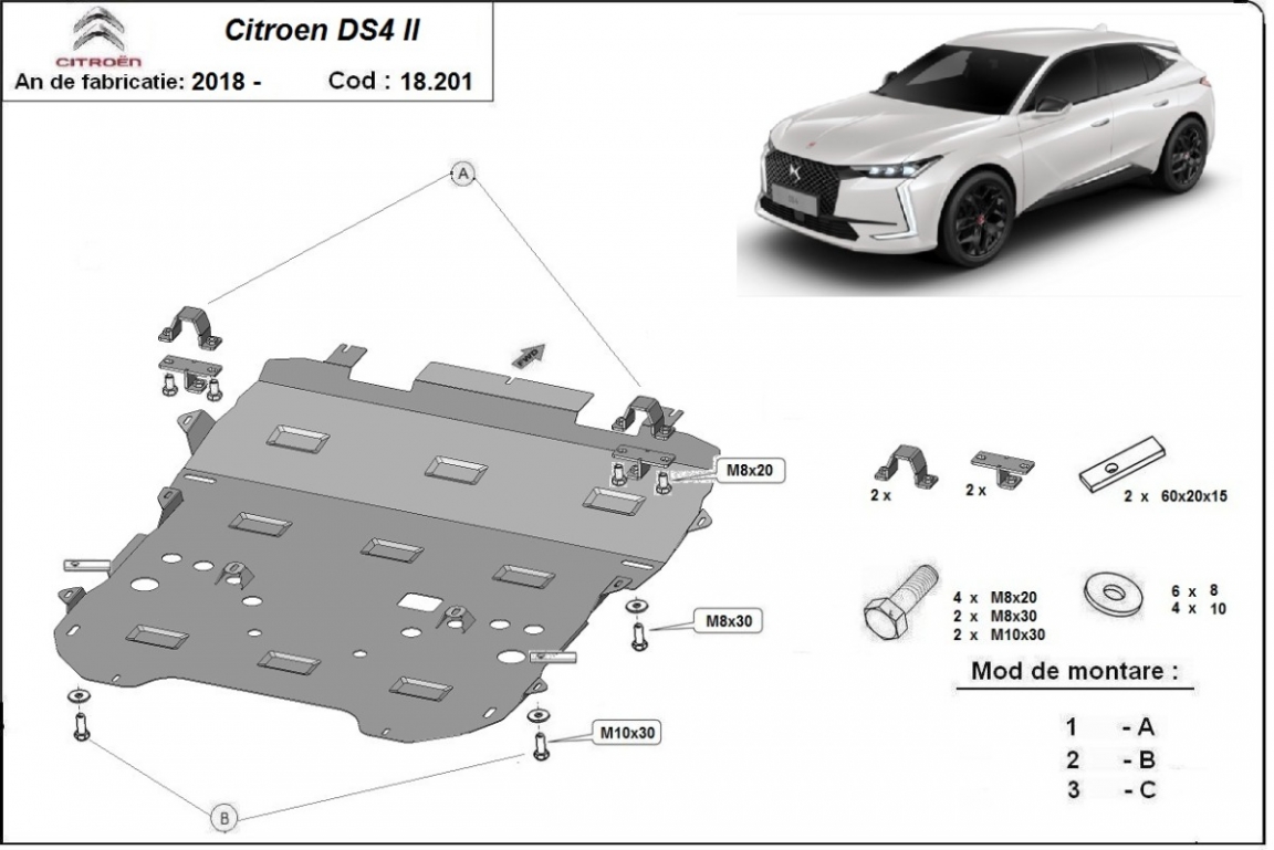 Skid plate for the protection of the: engine, gearbox, radiator, front bumper, subframe The skid plate is new and fits perfectly for all versions of Citroen DS4 manufactured between 2021 and 2026. Made out of 2 mm thick Steel plate. Screws, nuts, clips, all fastening accessories are included. All skid plates are powder coated to prevent corrosion. The exterior of the skid plate is provided with Steel reinforcements, which increases the resistance to impact. |