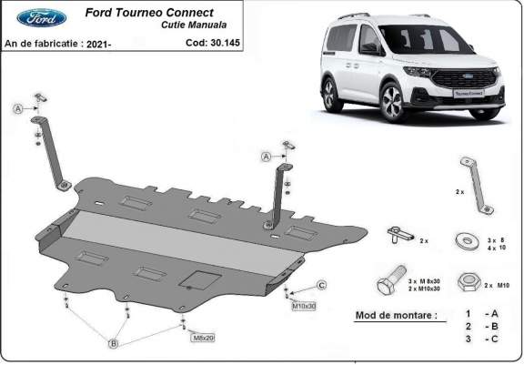 Skid plate for the protection of the: engine, gearbox, radiator, front bumper The skid plate is new and fits perfectly for all versions of Ford Tourneo Connect manufactured between 2021 and 2026. It has an opening for the oil sump, so it's removal won't be necessary to change the oil. Made out of 2 mm thick Steel plate. Screws, nuts, clips, all fastening accessories are included. All skid plates are powder coated to prevent corrosion. The exterior of the skid plate is provided with Steel reinforcements, which increases the resistance to impact. |