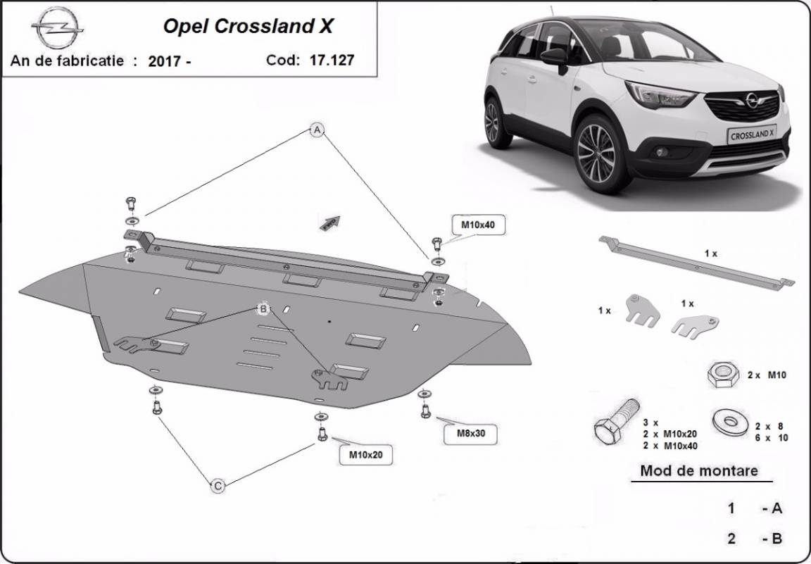 Skid plate for the protection of the: engine, gearbox, radiator, front bumper The skid plate is new and fits perfectly for all versions of Opel Crossland X manufactured between 2017 and 2026. Made out of 2 mm thick Steel plate. Screws, nuts, clips, all fastening accessories are included. All skid plates are powder coated to prevent corrosion. The exterior of the skid plate is provided with Steel reinforcements, which increases the resistance to impact. |