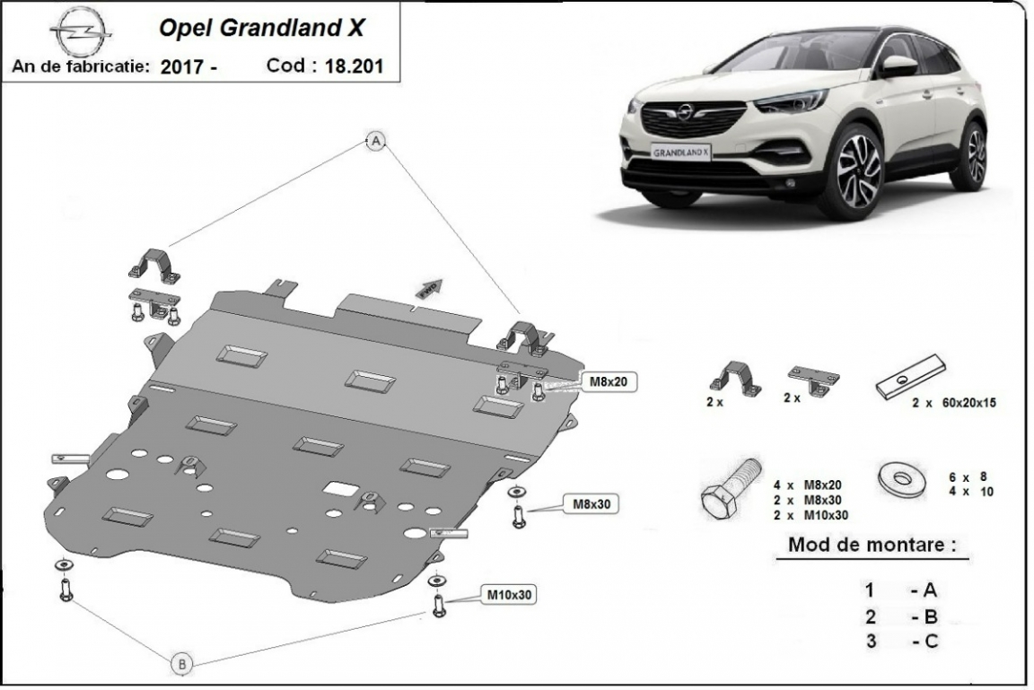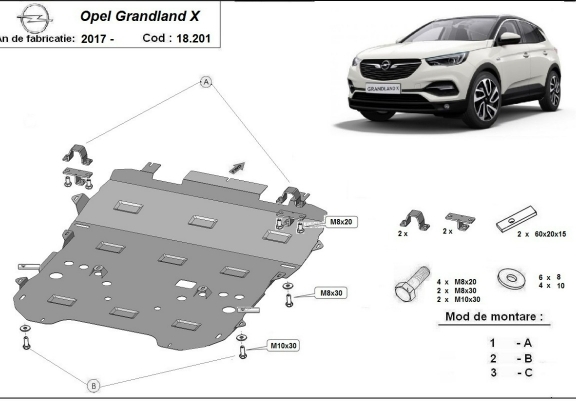 Skid plate for the protection of the: engine, gearbox, radiator, front bumper, subframe The skid plate is new and fits perfectly for all versions of Opel Grandland X manufactured between 2017 and 2026. Made out of 2 mm thick Steel plate. Screws, nuts, clips, all fastening accessories are included. All skid plates are powder coated to prevent corrosion. The exterior of the skid plate is provided with Steel reinforcements, which increases the resistance to impact. |