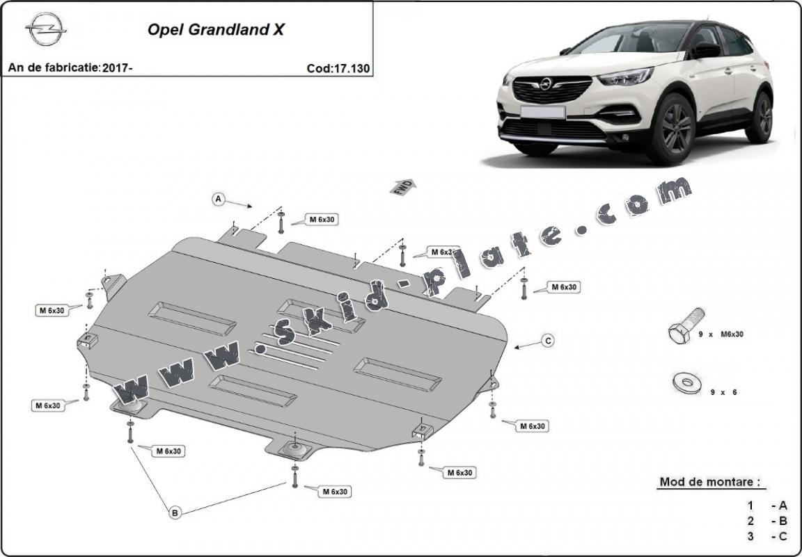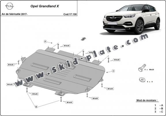 Skid plate for the protection of the: engine, gearbox, radiator The skid plate is new and fits perfectly for all versions of Opel Grandland X manufactured between 2017 and 2025. Made out of 2 mm thick Steel plate. Screws, nuts, clips, all fastening accessories are included. All skid plates are powder coated to prevent corrosion. The exterior of the skid plate is provided with Steel reinforcements, which increases the resistance to impact. |