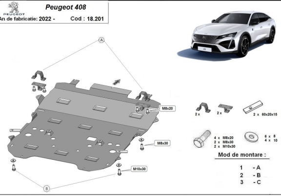 Skid plate for the protection of the: engine, gearbox, radiator, front bumper The skid plate is new and fits perfectly for all versions of Peugeot 408 manufactured between 2022 and 2026. Made out of 2 mm thick Steel plate. Screws, nuts, clips, all fastening accessories are included. All skid plates are powder coated to prevent corrosion. The exterior of the skid plate is provided with Steel reinforcements, which increases the resistance to impact. |