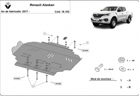 Skid plate for the protection of the: engine The skid plate is new and fits perfectly for all versions of Renault Alaskan manufactured between 2017 and 2026. Made out of 2.5 mm thick Steel plate. Screws, nuts, clips, all fastening accessories are included. All skid plates are powder coated to prevent corrosion. The exterior of the skid plate is provided with Steel reinforcements, which increases the resistance to impact. |