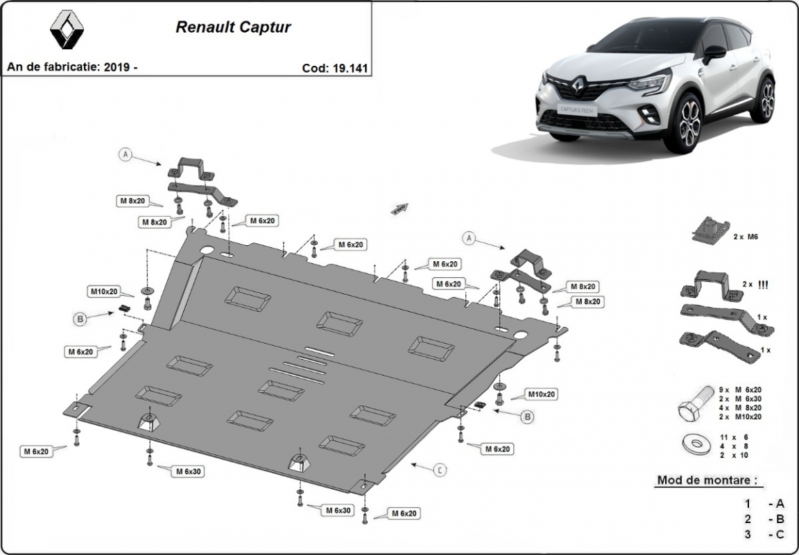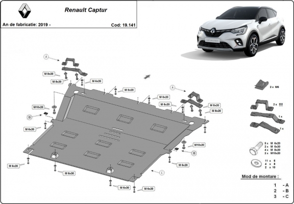 Skid plate for the protection of the: engine, gearbox, radiator The skid plate is new and fits perfectly for all versions of Renault Captur manufactured between 2019 and 2026. Made out of 2 mm thick Steel plate. Screws, nuts, clips, all fastening accessories are included. All skid plates are powder coated to prevent corrosion. The exterior of the skid plate is provided with Steel reinforcements, which increases the resistance to impact. |