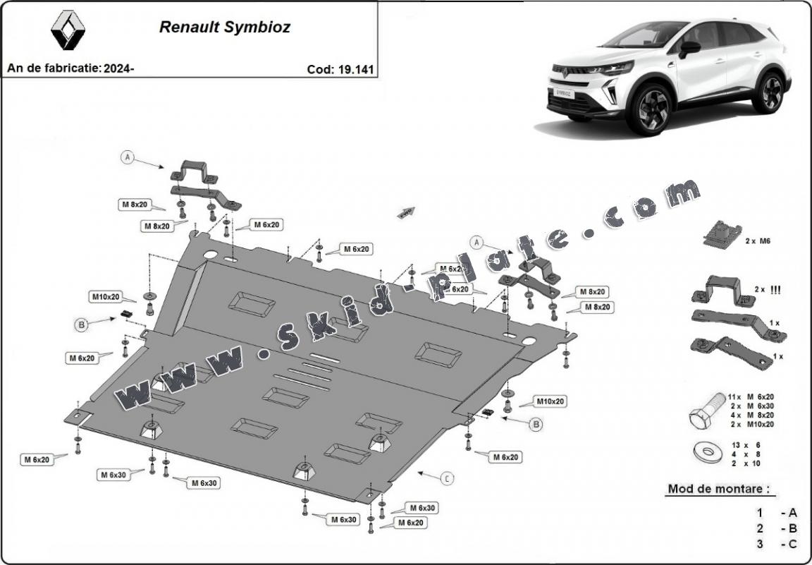Skid plate for the protection of the: engine, gearbox, radiator The skid plate is new and fits perfectly for all versions of Renault Symbioz manufactured between 2024 and 2025. Made out of 2 mm thick Steel plate. Screws, nuts, clips, all fastening accessories are included. All skid plates are powder coated to prevent corrosion. The exterior of the skid plate is provided with Steel reinforcements, which increases the resistance to impact. |
