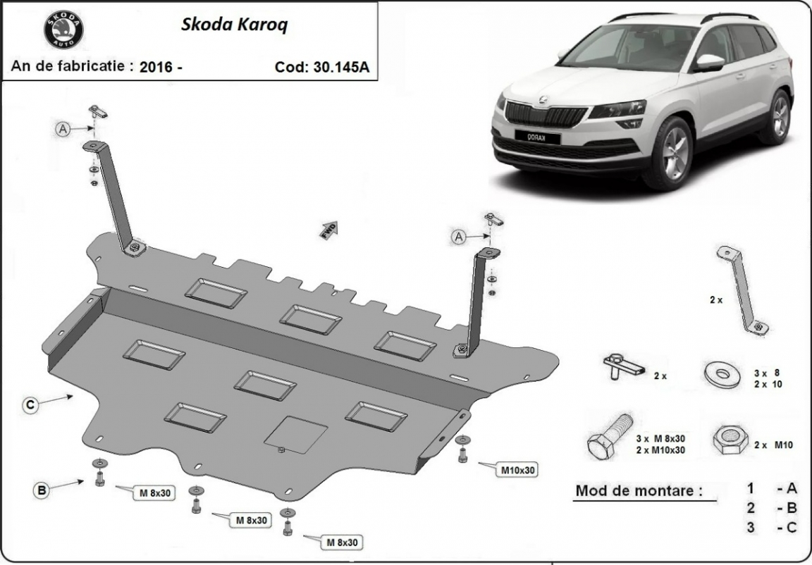Skid plate for the protection of the: engine, gearbox, radiator, front bumper The skid plate is new and fits perfectly for all versions of Skoda Karoq manufactured between 2017 and 2026. It has an opening for the oil sump, so it's removal won't be necessary to change the oil. Made out of 2 mm thick Steel plate. Screws, nuts, clips, all fastening accessories are included. All skid plates are powder coated to prevent corrosion. The exterior of the skid plate is provided with Steel reinforcements, which increases the resistance to impact. |
