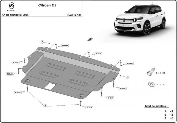 Steel skid plate for the protection of the engine and the gearbox for Citroen C3 (2024-2026)