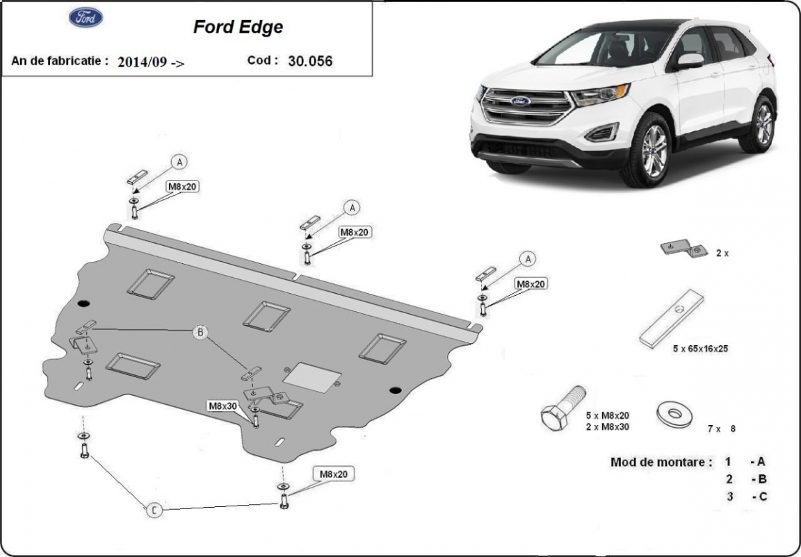 Skid plate for the protection of the: engine, gearbox, radiator The skid plate is new and fits perfectly for all versions of Ford Edge manufactured between 2014 and 2021. Made out of 2 mm thick Steel plate. Screws, nuts, clips, all fastening accessories are included. All skid plates are powder coated to prevent corrosion. The exterior of the skid plate is provided with Steel reinforcements, which increases the resistance to impact. |