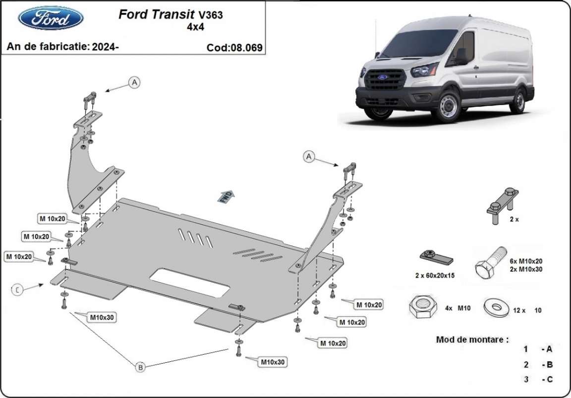 Skid plate for the protection of the: engine, gearbox, radiator The skid plate is new and fits perfectly for all versions of Ford Transit V363 manufactured between 2024 and 2026. Made out of 2.5 mm thick Steel plate. Screws, nuts, clips, all fastening accessories are included. All skid plates are powder coated to prevent corrosion. The exterior of the skid plate is provided with Steel reinforcements, which increases the resistance to impact. |