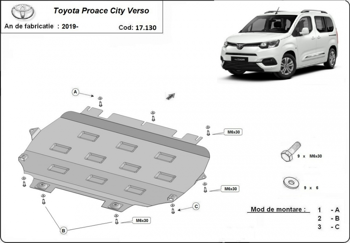 Skid plate for the protection of the: engine, gearbox, radiator The skid plate is new and fits perfectly for the Toyota Proace City, with the following engine/drive versions: 1.2 petrol, 1.5 diesel - manufactured between 2019 and 2026. Made out of 2 mm thick Steel plate. Screws, nuts, clips, all fastening accessories are included. All skid plates are powder coated to prevent corrosion. The exterior of the skid plate is provided with Steel reinforcements, which increases the resistance to impact. |