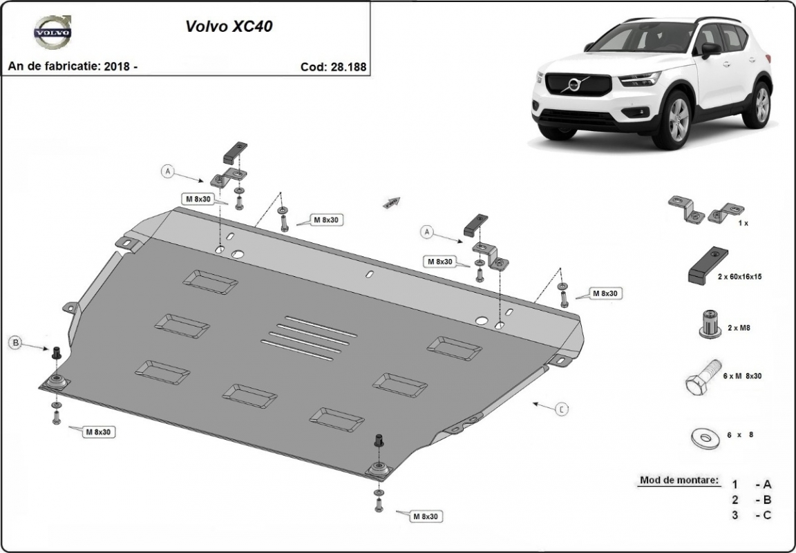Skid plate for the protection of the: engine, gearbox, radiator The skid plate is new and fits perfectly for all versions of Volvo XC40 manufactured between 2018 and 2026. Made out of 2 mm thick Steel plate. Screws, nuts, clips, all fastening accessories are included. All skid plates are powder coated to prevent corrosion. The exterior of the skid plate is provided with Steel reinforcements, which increases the resistance to impact. |
