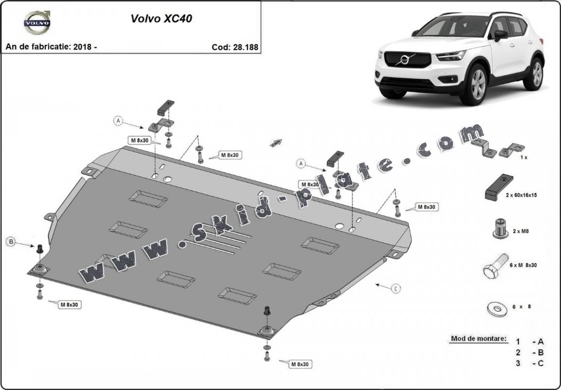 Skid plate for the protection of the: engine, gearbox, radiator The skid plate is new and fits perfectly for all versions of Volvo XC40 manufactured between 2018 and 2025. Made out of 2 mm thick Steel plate. Screws, nuts, clips, all fastening accessories are included. All skid plates are powder coated to prevent corrosion. The exterior of the skid plate is provided with Steel reinforcements, which increases the resistance to impact. |