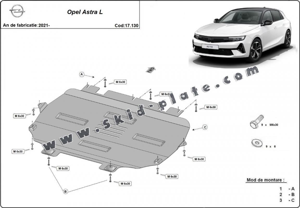 Skid plate for the protection of the: engine, gearbox, radiator The skid plate is new and fits perfectly for all versions of Opel Astra L manufactured between 2021 and 2025. Made out of 2 mm thick Steel plate. Screws, nuts, clips, all fastening accessories are included. All skid plates are powder coated to prevent corrosion. The exterior of the skid plate is provided with Steel reinforcements, which increases the resistance to impact. |